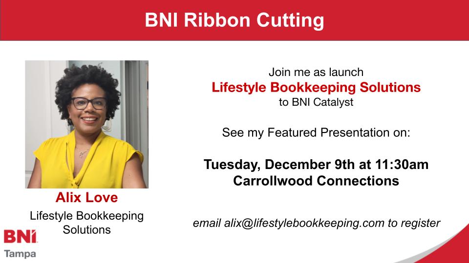 Join me on Tuesday, December 9th for a Ribbon Cutting event as I launch Lifestyle Bookkeeping to BNI Catalyst. Learn about my approach to bookkeeping that provides calm and clarity for small business owners. Contact me for registration details.